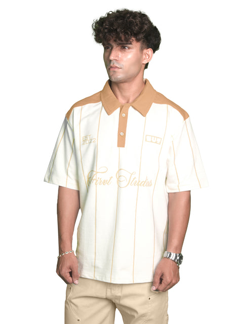 Crafted from heavyweight 260 GSM cotton terry, this polo delivers the perfect balance of structure and softness. Designed with subtle vertical stripes and a contrasting sand-toned collar, it brings a refined stadium aesthetic to everyday wear.